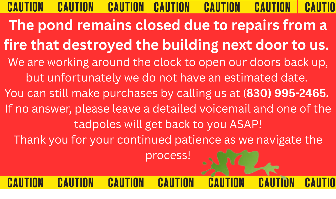 Give the pond a call, (830) 995-2465 and a tadpole can assist you!
